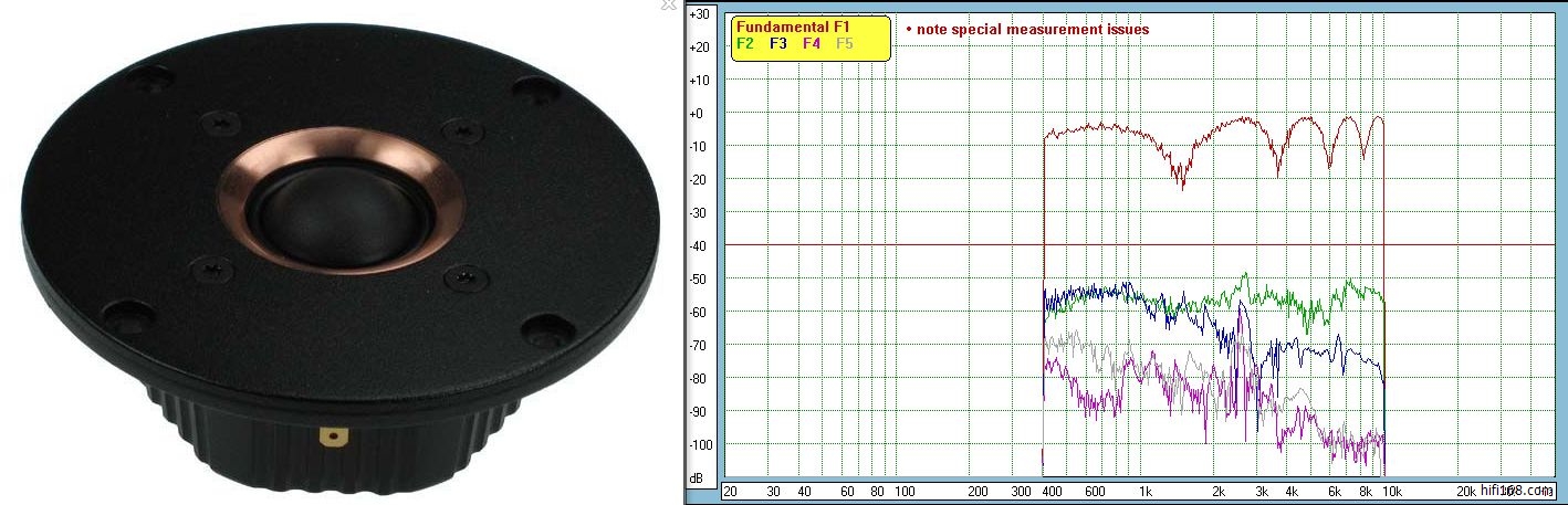高音单元采用挪威西雅士seas黄金系列高音E0011,这单元面板的金色环实际也是一个浅波导,实测失真延伸至1.5khz也只有0.3%左右(-50db),高频的下限非常好