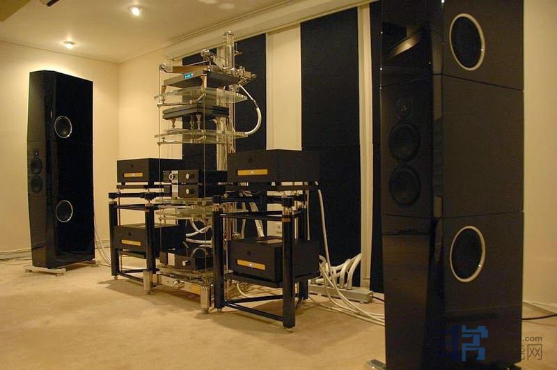 网络找到的图片,非常发烧的音响架结构; 虽然有这样的音响架加持,如果可以移到侧面或是更远离音箱,我相信会更好。