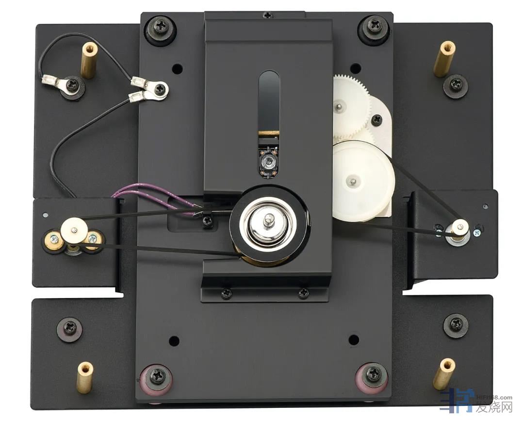 入门级的TL-5转盘只有一组用于主轴的皮带驱动器,神奇的是结构很简单,但听起来已经和普通CD机有所不同。TL-2N隐藏在中央黑色玻璃下的皮带驱动器表面上只能看到一条皮带,但结构要复杂得多,不仅光盘由皮带带动旋转,激光头也由皮带定位。因为每个马达在转动时都会产生磁极震动和不断变化的强大磁场。在激光头附近肯定有影响,把二者分隔开再以皮带做软耦合,好处很明显。重而大的CD镇最大程度降低了光盘的晃动,CEC又在马达与主轴下方加上大约3mm大的弹簧支架,让TL-2N有着如同黑胶唱盘一样的精密结构。