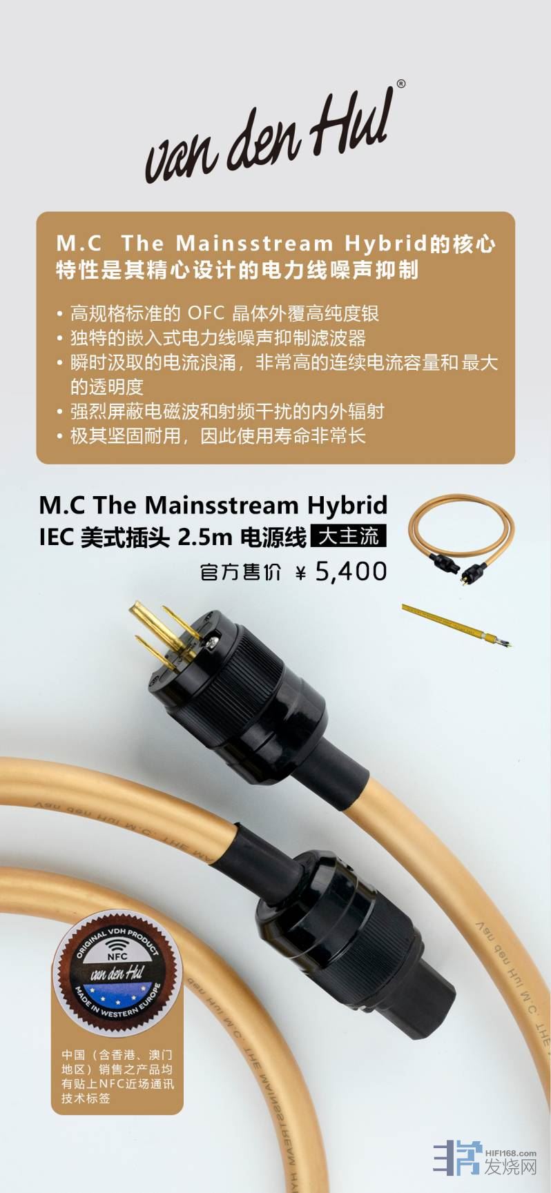 M.C The Mainsstream Hybrid 大主流 电源线是荷兰范登豪 V.D.H. 特制的高质量重量级电源线。线身采用高规格标准的 OFC 晶体外覆高纯度银。特别设计用来传送稳定的主电源到 high-end 影音系统以及其他专业的设备,同时也能传送无限制,低干扰的主电源电流。 大主流最重要的特征就是经过周密设计的干扰抑制特性 :首先,The MAINSSTREAM HYBRID 的特殊合成导体结构被设计作为一种植入性的电源线 滤波器。可有效的抑制高频率的电源干扰,而不会对电流的传输限制造成影响。不像一般常见的滤波器,The MAINSSTREAM HYBRID 没有使用任何滤波零件于串联的电流路径上,串联阻抗是几乎不存在的小,所以这线材可说是没有电流限制,共振,或是迟钝的反应,是一条川流不息,洁净的主电源。