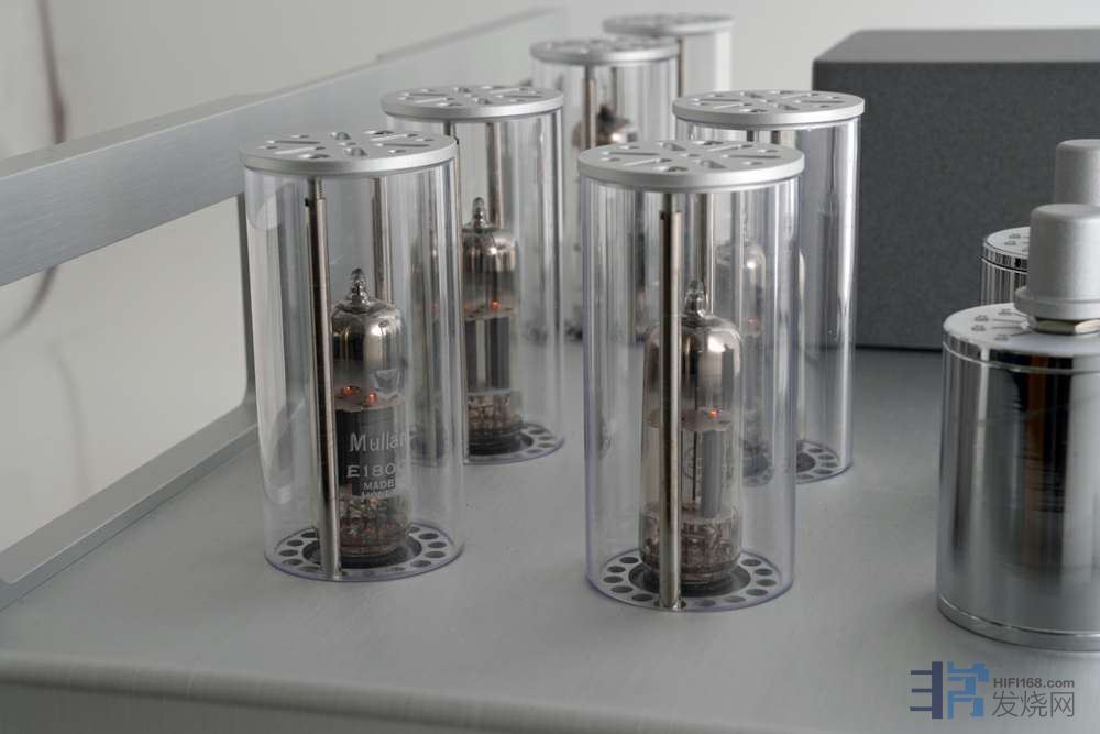 H-5500 整机采用6支真空管,包括四支英国 Mullard NOS (New Old Stock ) E180CC 双三极管作左右声道的讯号放大, 还配备一支GE的7233 作稳压和同样是GE出品的5654 真空管作电压校正(同样是NOS产品),全部带有铝制通风顶部的亚加力管罩。看到这里,大家可能会怀疑这样的设计会否影响到真空管的散热,其实Allnic的这种设计是有科学根据的,这样的胆罩设计能产生「烟囱效应」让空气垂直对流,反而更有利于真空管的散热,同时还起到了一定的保护作用。或者现实一点说,最少外观上都比较现代化,比较起旧式的笼形胆罩,放在器材架上都美观大方不少吧(笑)。
