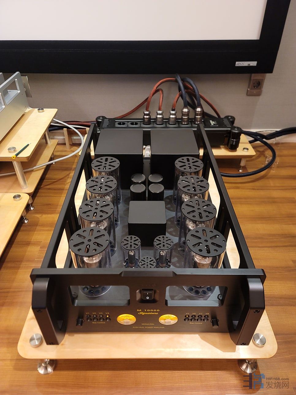 Allnic(奥立)的新旗舰单声道真空管功率放大器M-10000 Signature已经抵达聆听室。它的体积和重量非常巨大,两个人几乎都抬不起来,但其密集的输出管、驱动管、初级管、扼流变压器、电源变压器和输出变压器确实令人印象深刻。输出使用8个KT170束射管,产生高达500W的输出功率。这是真正的巨无霸。