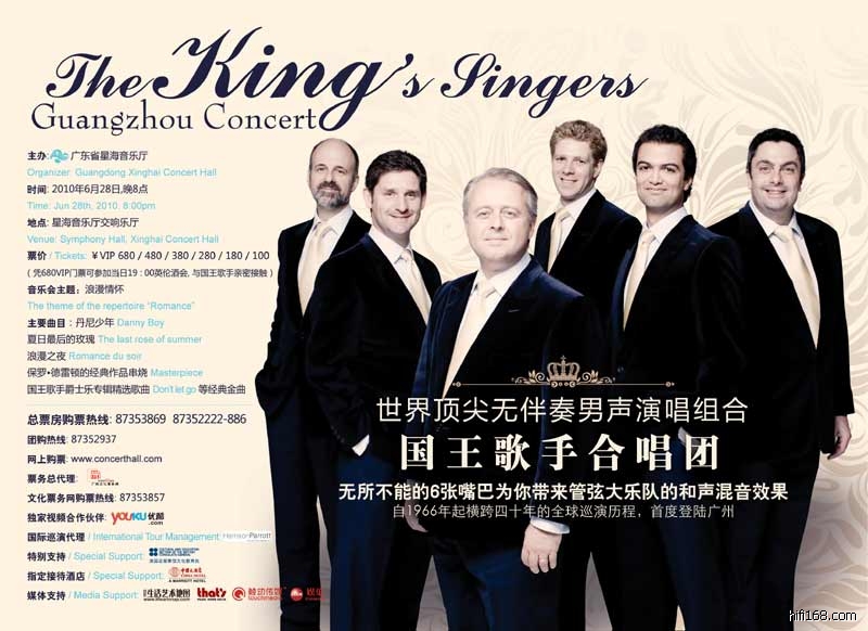 1965年 --「国王歌手」的诞生,要回溯到 1965年。当时英国剑桥的「国王学院」有十四个参与合唱团的学生,共同组成一支命名为「The Schola Cantorum Pro Musica Profana」的团体,并且录制了一张不对外发行的流行歌曲专辑。由于演出很成功,其中三位团员结合另外三位同学,共组一支名叫「来自国王学院的六个合唱学生」(Six Choral Scholars From King‘s College)的六重唱,也就是「国王歌手」的前身。本来团名想取作“剑桥男孩”,但后来为了表明团体人员的身份,于是打上了剑桥国王学院的旗号,使用了「国王歌手」这样听来比较有分量的名字。1966年5月1日,第一任国王歌手们在伦敦伊丽莎白音乐厅首次举办了他们的音乐会,历史上最棒的无伴奏合唱团诞生了。歌手们除了要应付学习,还要每周的周末在学校的教堂唱诗,并在各种晚会和社交场合献艺。从合唱团成立伊始就不断给学院带来荣誉,40年来,国王歌手获得了无数奖项,跟众多的大牌明星合作过,对于国王歌手的歌迷来说,国王歌手就好比流行乐迷眼中的披头士、古典爱乐者心目中的“三大男高音”。