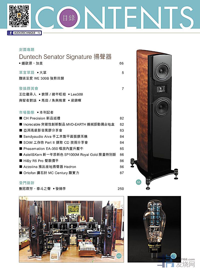 今期封面专题由锺启源、加里评论Duntech Senator Signature扬声器,草言草语 : 胆迷至爱 WE 300B强势回归,其他评论文章包括:EAR Yoshino EAR 834T合并放大器、 Accuphase AC-6动圈唱头、Audia Flight FL Three S合并式扩音机  Wadax Arcadia DACAlsyvox Botticelli 屏风喇叭、EAT E-Glo S唱头放大器及LPS线性电源供应器  Gryphon Audio Zena前级放大器  CH Precision D1.1 SACD / CD 转盘, C1.1 立体声译码器, T1 外置时钟 , X1 外置电源 MAD 1920小型扬声器、Faith Audio 旗舰级「夸父」电源线及「神农」总线版电源线 Spendor A7扬声器、QUAD PA-ONE+真空管译码耳机/前级两用放大器 Sony WH-1000XM3无线降噪耳机 + NW-A55随身播放器、Vision Ears EVE Frozen耳机、 OPPO UDP-205 Extreme Power升级版 Pioneer UDP-LX800 宇宙盘 +FIBBR Crystal HDMI Cable  ....,详细内容请参阅目录。