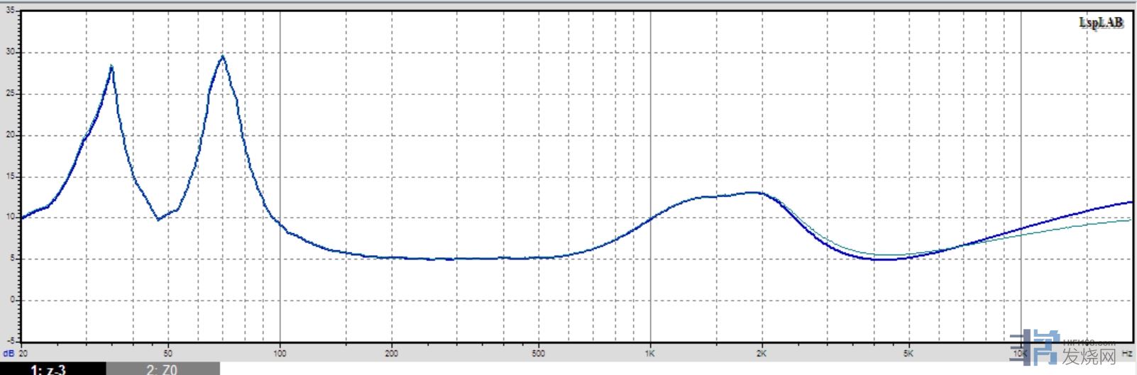 自然声NS15的频响曲线,三条高频线代表高音3档(+2db,0db,-2db),虚线为+/-2db区间,80-20000Hz范围