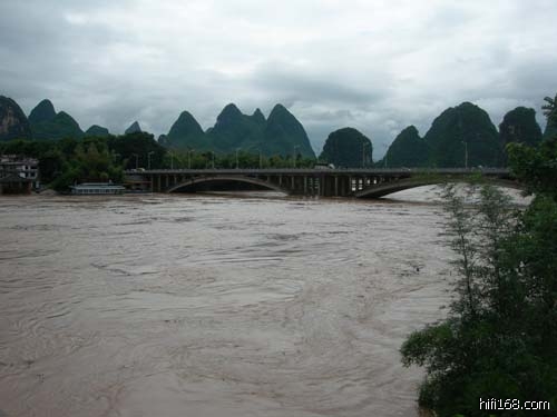 由于漓江上游及阳朔县连降大到暴雨,气象部门预测今晚到明天有暴雨过程,漓江水位持续上涨,漓江洪峰(13日)早上10时左右经过县城,漓江阳朔站水位目前达到112.18米(超警戒水位2.5米左右)。