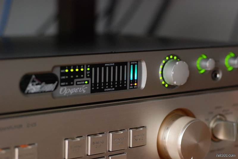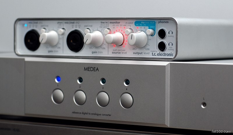 一代的Medea是支持双路AES接收192信号,单路只支持到96K,我拆开看过接收IC是两片CS8413。借刘汉盛的图片可以看看一代,接收晶片在中间的排线上面,注意看两个双排贴片SSOP封装的元件就是。