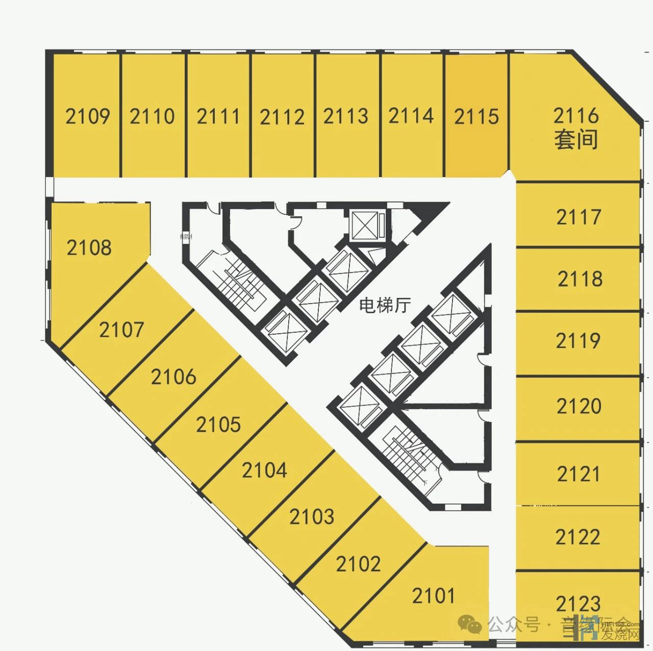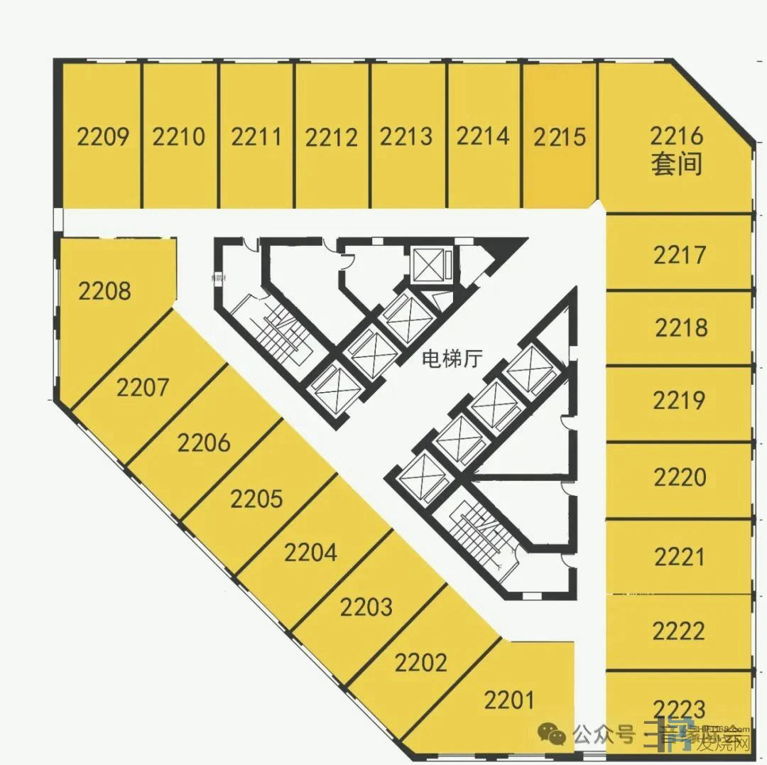 21-23楼,每层提供23间展房,包括1个套间和22个单间。