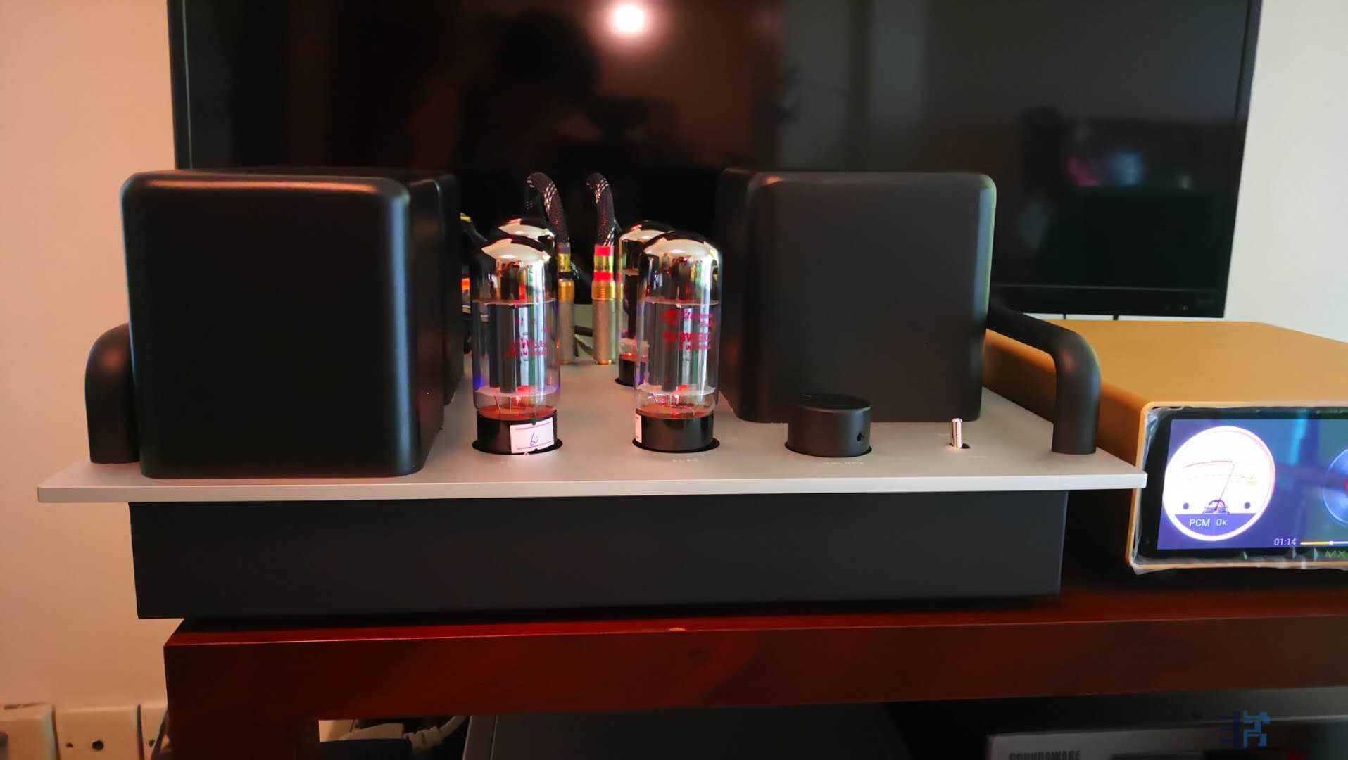 以前没有玩过胆机,感谢HIFI168论坛和关氏胆机让我有机会享受胆机的独特魅力。接入自己的系统短短听了几天,最大的感受是整个系统的中频有很大的提高,带动了整个音场感觉非常饱满,听人声和弦乐感觉非常温暖和细腻,其次是各种器乐的演奏弹性十足,丝丝入扣。关氏K6 胆机使用的电子管灯泡都是非常普及的管子,但出来的声音却不普通,容易一听中毒啊。