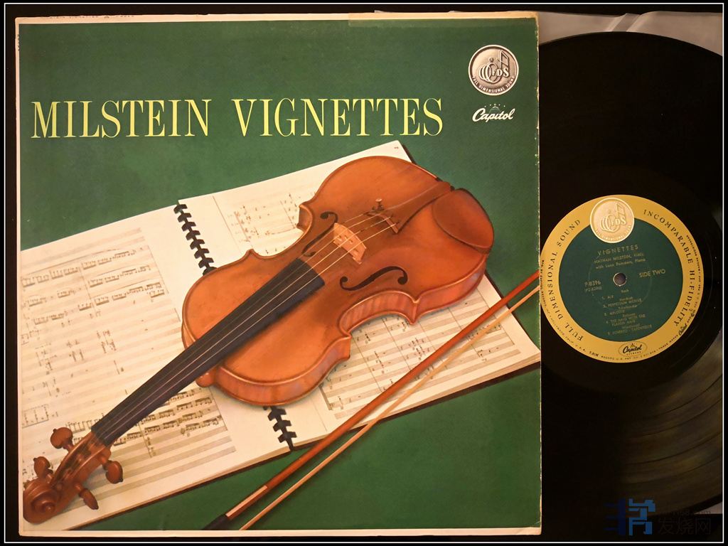 1、 首先是米尔斯坦在单声道时期的优秀录音,这张唱片我在自己的公众号提到过,我戏称它为“绿米”,米尔斯坦这张小品的曲目很冷门,很多曲目是他自己改编的,米尔斯坦对作品的内涵演绎和拉宾、里奇那种张扬炫技完全不同,小提琴那种温润柔美,气度非凡,录音更是达到单声道作品的顶峰,全频的细节展现很均衡,雷诺坡米尔斯的钢琴伴奏也是相当出彩,触键雄浑有力,钢琴低频的力度饱满,是测试系统低频速度和量感的重要参考,大家肯定很熟悉拉宾的小品集——马赛克,钢琴伴奏也是出自这位Leno pommers,Capitol唱片黄金录音时期的重要绿叶,推荐从SIDE 2开始听,你会欲罢不能: