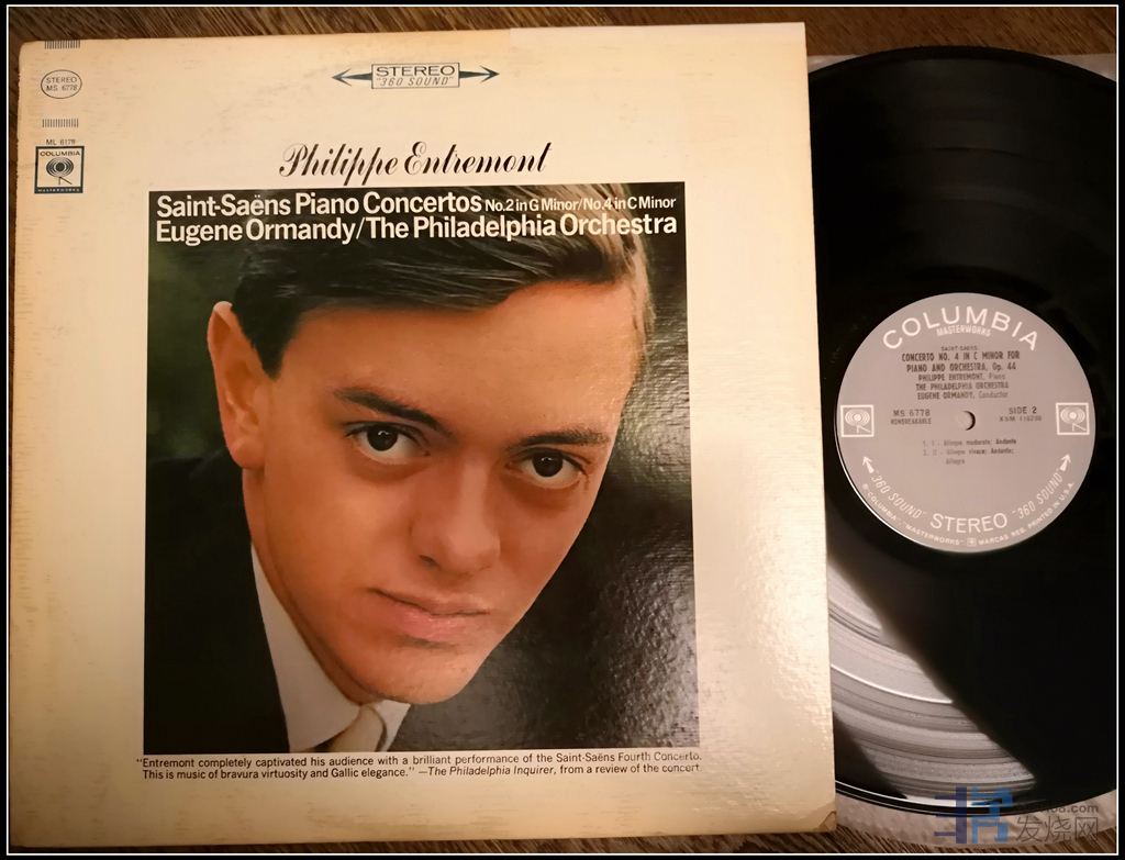 2、 第二张是一张冷门,这位演奏家叫Philippe entremont(菲利普昂特蒙),现在还在世,出生在法国,我可能对法国音乐家情有独钟,内心里像是有感应似的,这张唱片我在北京员外家访时首次听到,记得当时快要听睡着了,他随即放这张唱片给我听,一下就给震醒了,哈哈哈,可见是多发烧,他的演绎应该是我听过最狠的圣桑钢协,没有之一,可能和圣桑同样是法国人的关系吧,昂特蒙的演奏尤其卖力,加上奥曼迪指挥的乐团演奏也同样出色,录音也是CBS的顶级水准,我也给这唱片起个外号叫“大眼仔”,推荐也是从side 2开始,圣桑的第四钢协没有第二这么有名,但是你只要听过昂特蒙的演绎,一定会记住这首钢协,太过瘾了,同时这张黑胶也十分考究你的黑胶系统的调整水平,因为昂特蒙的击键力度非常大,没调好的唱盘可能会破音,买来试试吧哈: