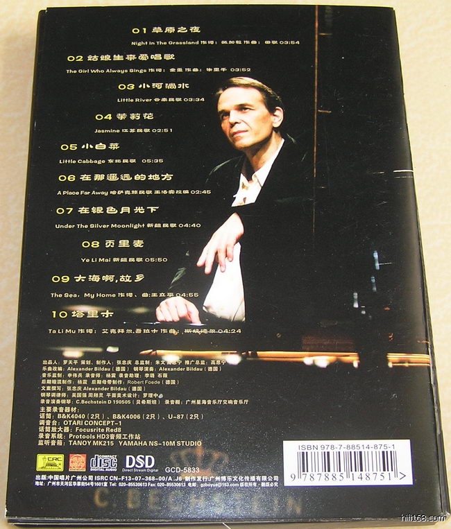 粗浅的感觉,录音很好,名琴贝希斯坦的声音真的很清澈很有质感,琴声穿透力很不错! 钢琴的立体感和音场的三维空间感很突出,介绍是用了两只B&K4040金话筒作主话筒在广州星海音乐厅录制,看来是体现了顶级钢琴顶级录音器材的特点的。 德国钢琴家亚历山大.碧乐岛(Alexander Bildau)用西方音乐元素改编的中国民歌听起来还是不习惯,也许西方人听了会有新鲜感但我觉得有点别扭感,少了中国音乐特有的旋律美感和韵味,这点不如殷承宗改编的中国音乐专辑《花月夜》。册子里介绍说:爵士音乐爱好者会在《姑娘生来爱唱歌》中听到PAUL DESMOND的《Take Five》中的节奏型;《页里麦》被融化在BACH的合唱前奏曲中;《小白菜》的和声功能参考了SATIE的《Gymonp e dies》;一些PIAZZOLLA的《Tango》中的音符被用在了《塔里木》中;《茉莉花》中则有GEORGE GERSHWIN的影子......
