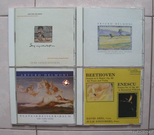 这四张都是绝美的小提琴名盘JMR(妈妈教我的歌)JMR(弗兰克与福雷奏鸣曲)(JMR妈妈教我的歌2)(Wilson小提琴奏鸣曲)把把都是名琴,每位演译高超,说到录音就没话说了,其中一张JMR1996年发行的CD(妈妈教我的歌2),我比较喜欢拿来试中高频的自然度和厚润度,因为里面所拉的都是一些短少的作品,是一把小提琴独奏,没其它背景装饰,如果你的中高频去到尽头时不够自然不够厚润的话,就象一把尖锐的刀一样冷莫!