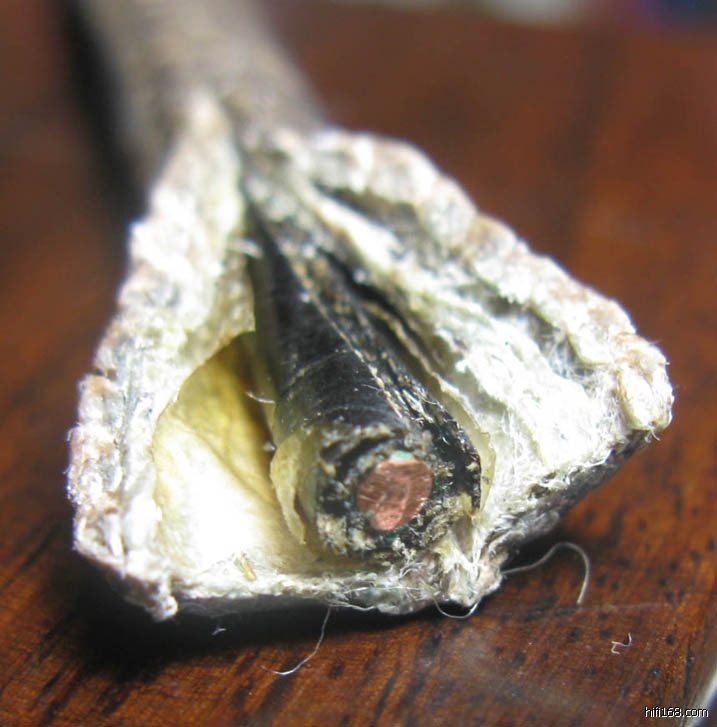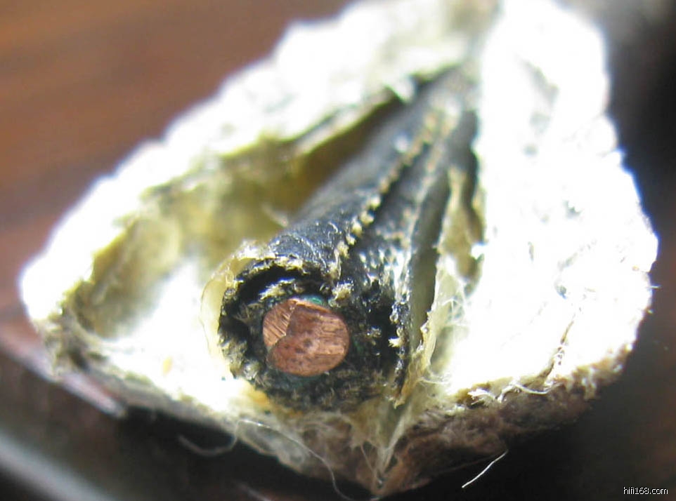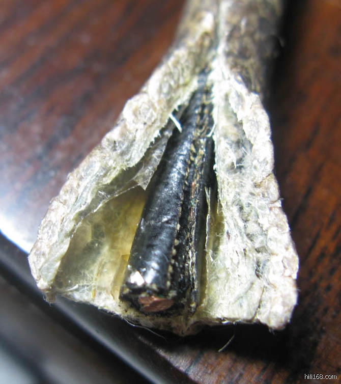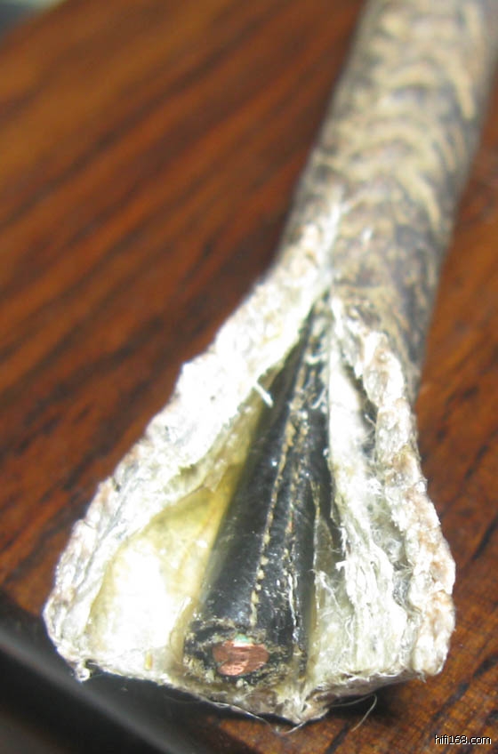 很旧的线,包皮都油脂化了,线粗7毫米左右,铜芯直径2毫米,JS说是西电线,我买了做成三股的2.5米电源线。