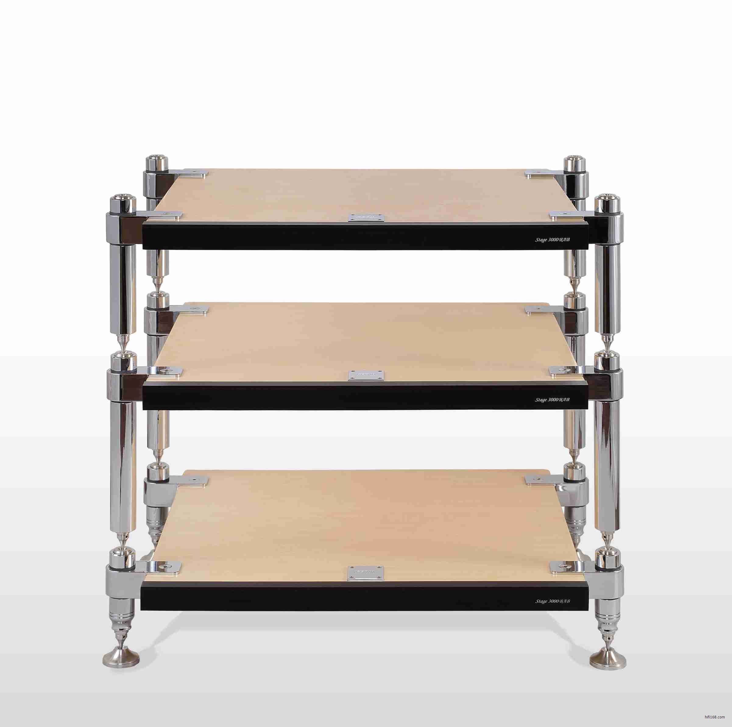 而我们现在迎进到国内的是Stage 3000BAB,这是该品牌最顶级的型号。每一层的立柱独立分开,用户可以随意搭配。立柱有黑色和镀锣两种选择,而层板的颜色有桦木本色,黑胡桃,纯黑三种。