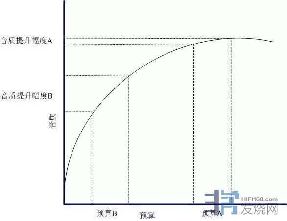 经济学有一个原理叫做边际递减效应,横轴是短评君投入的预算,竖轴是音质。图里有两个例子,我投入了预算B,看到竖轴反应出来的音质提升幅度B是巨大的,如果我再往上加预算,变成预算A,由于边际递减效应,我获得的提升幅度A比幅度B小了很多。