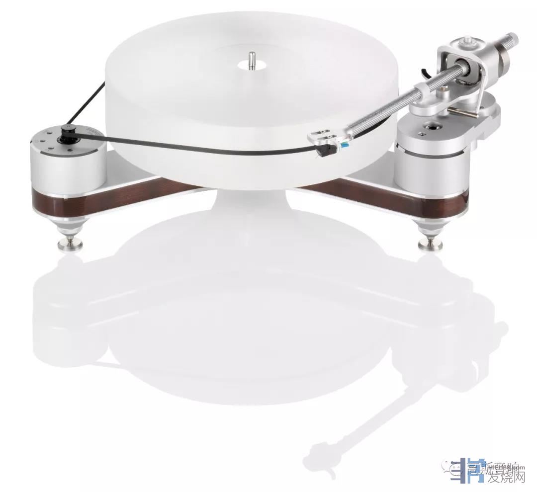 德国Clearaudio“老三”的Innovation,其在地位上是承前启后的。除了旗舰Statement外,Innovation更是厂家在技术上的原型。Innovation工艺精致简洁,结构上采用精美防弹木和铝金属底座叠加而成,防弹木表层经过高精度计算机切割制作,与铝金属底座组成起到很好的防谐振效果。在转速上,控制键位于马达轴承的支柱上,分别有33 1/34578 rpm三档控速,当中具有红外线传感器与光学转速控制系统(Optical SpeedControl)的配合,可确保出色的速度稳定水平。InnovationDC马达是厂家专为其设计的高扭力作品,可以不费吹灰之力地使厚达70mm厚的高密度POMPolyoxymethylene)材料承盘(该种材料在抑制谐振等稳定性上比传统的亚克力效果更好)轻松旋转。Innovation之所以能轻松做到此,更得益于“核心部件”磁悬浮陶瓷轴承(Ceramic MagneticBearing),这个机构的加工要求精度极高,需要非常熟练的匠人手工作业,这种结构,让唱盘仿佛是乘着飞碟气垫一样浮在空中,保持悬浮的状态。得益于这个结构,厂家表示能“消除”转动时的摩擦,能平均承托15mm厚度的不锈钢底盘。这是世界最高级的设计,具有压倒性的顺滑转动与精准无比的转速,是新的世界标准,也是德国Clearaudio享誉世界的核心技术。