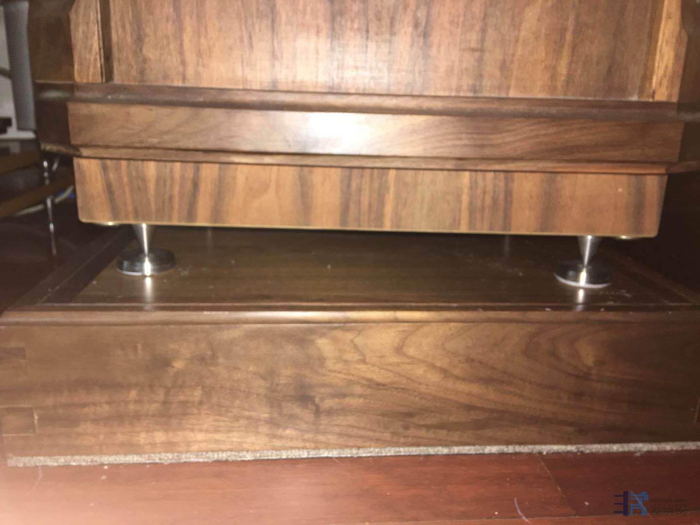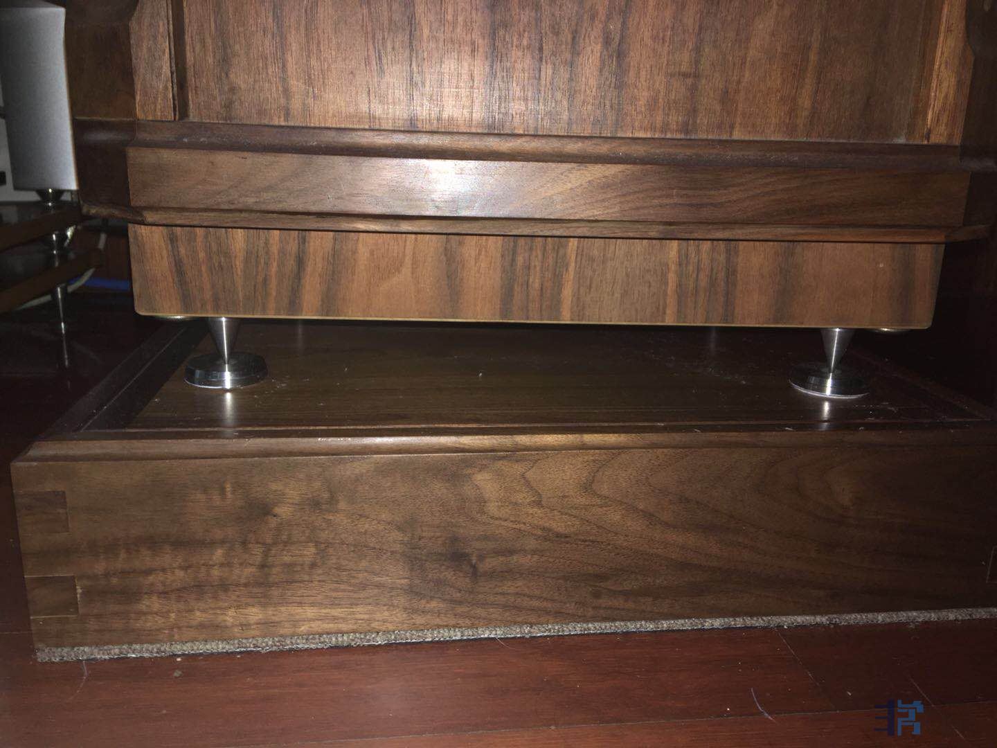 当初我是放于天朗贵族系列箱子下的,一方面是抬高高度,另一方面是避震效果,现替换了大理石,声音效果各有特点,根据个人喜好,成色95新,该避震厚木箱重量有10公斤左右,面子上有少许划痕,是放箱子脚钉留下的,尺寸:50×40×10cm.出售价格1000元。联系电话:13901608831.当初买避震厚木箱,咨询大昌公司的工作人员,它的结构是有三层厚度2.5公分的实木加上黑金沙做成的,外面用胡桃木贴皮。音箱放在该避震厚木盒子上后,低音结实。
