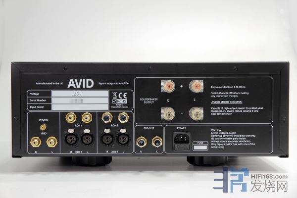 AVID-HIFI Sigsum有四组高电平输入,两组单端两组平衡,外加一组唱头放大输入。此外,还有一组RCA前级输出可连接后级。