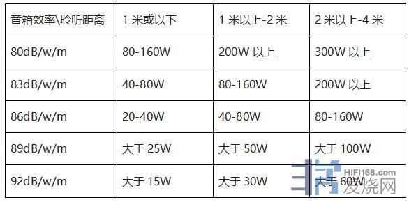 在此附上一个不同扬声器效率与聆听距离之下的放大器功率建议表给大家参考,一般说来除非是很小型的全音域单元音箱,通常效率不会低于80dB/w/m,而较为高价的大型落地扬声器效率才有机会高于90dB/w/m以上。