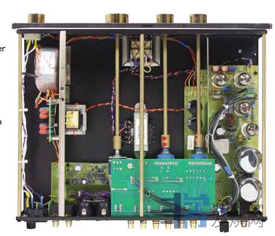 唱头均衡器搭载机种的内部,放大器被设置在左侧,靠近背面那一边设置的是收纳在圆筒形屏蔽盒内的升压变压器。