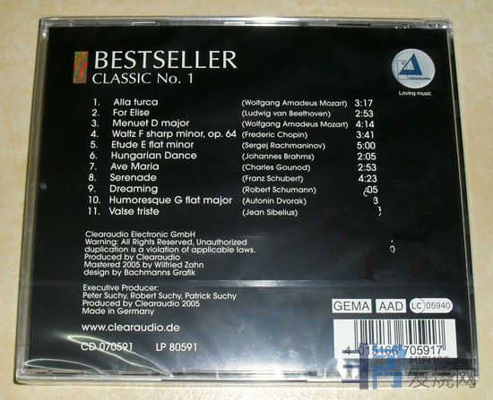 德国音响厂Clearaudio出品的试音CD,录音尽显高级LP独有的迷人特质,但网上很难找到其介绍。内容方面主要是小提琴和钢琴演奏最通俗的古典乐曲。如“Hungarian Dance 匈牙利舞曲”,“Ava Maria 圣母颂”,“For Elise 致爱丽丝”等,一听后就忘不了,透明、清甜、高雅、细致,又有厚度和穿透力,放起来满堂生辉。