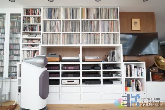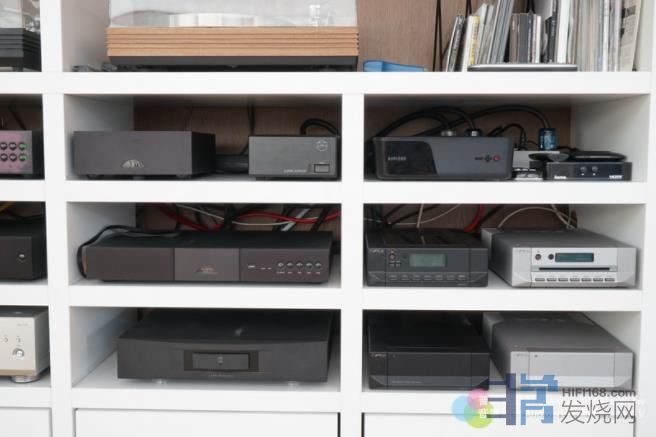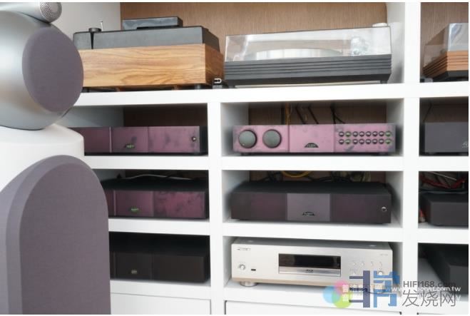 与去年不同的是,吴辉⾈听从我的建议,在左侧斜窗上加装伸缩式拉帘,喇叭后⾯的玻璃⾨也加了拉帘,地上铺了地毯,喇叭也按照去年我们试过的喇叭摆位来摆。为了伺候B&W 800D3,吴辉⾈原本就有⼀部Naim NAP-300后级,这部电源分离后级每声道输出虽然只有90⽡(8欧姆负载),但可以承受到2欧姆,供电很⾜。吴辉⾈以Bi Wire⽅式⽤⼆套NAP-300来推800D3,听起来就象是⽤300⽡后级⼀样够⼒,⽽且⾳量只开到10点钟就很饱满了。⾄于前级还是使⽤原本的Naim。数位讯源使⽤的是平价的Cyrus外接电源,加上Linn DAC。老实说我很惊讶不贵的数位讯源能够发出那么好的⾳质,听CD⼀样是那么好听。