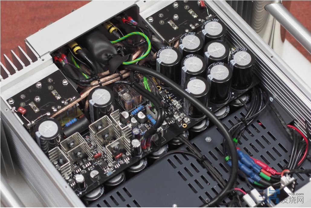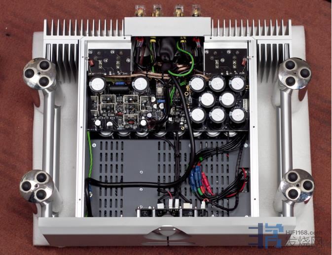 TO3功率晶体被横向锁在一块块垂直叠放的铝合金小板子上,再固定在背板内侧,每边共有8个功率晶体,每声道合计共使用16颗独家TO3功率晶体。