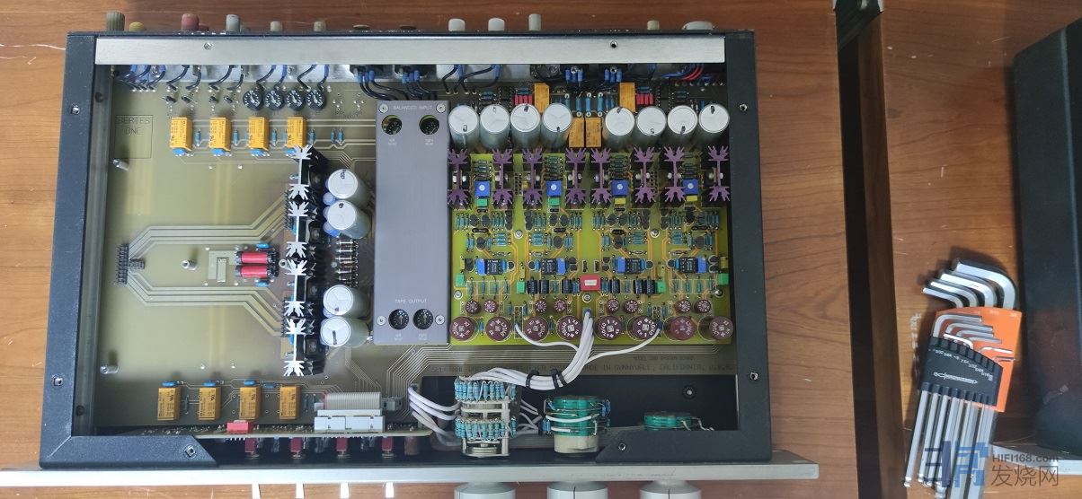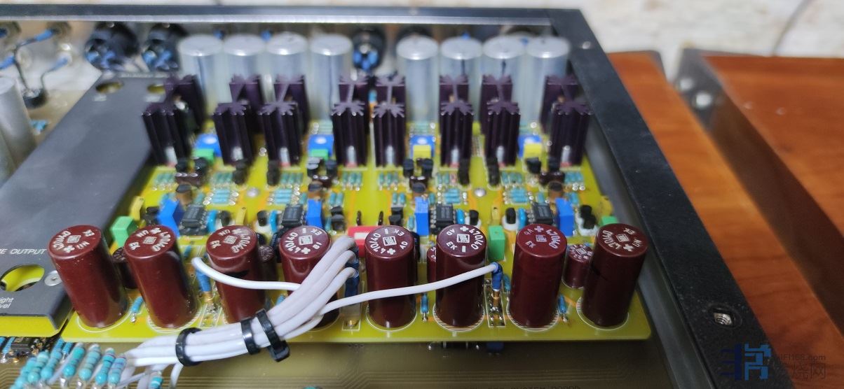 因为机器使用温度高,原装散热不佳,导致部分电路板老化。维修重作了主放大板,平衡输入放大版,用了加厚沉金优质PCB,电路完全复刻,原件为原装或者比原装升级,如主要电容更换更高级型号:由松下金字电容更换成了嘉美功 awf 电容,独立电源未动过。为了提升散热水平 加高了放大管散热片,然后用整块铝板作成顶盖,在散热器正上方打散热孔。