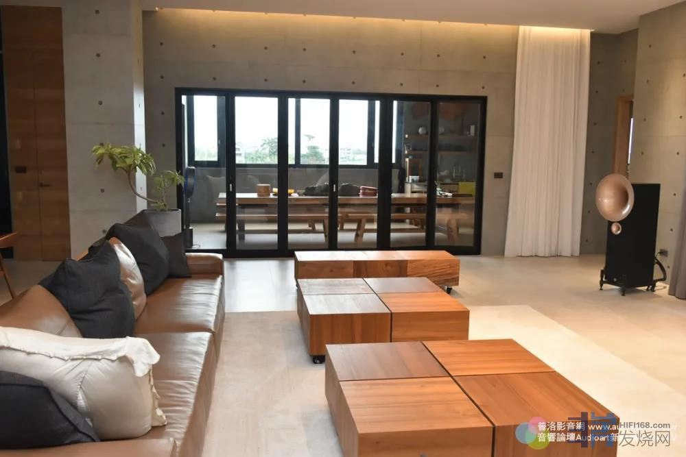 在擺放喇叭的後牆,由本篇主圖可以看到其實是一片大落地窗,雖然打開時有風景、採光也較好,但是因為反射音太多,音響效果會稍微扣分一點。