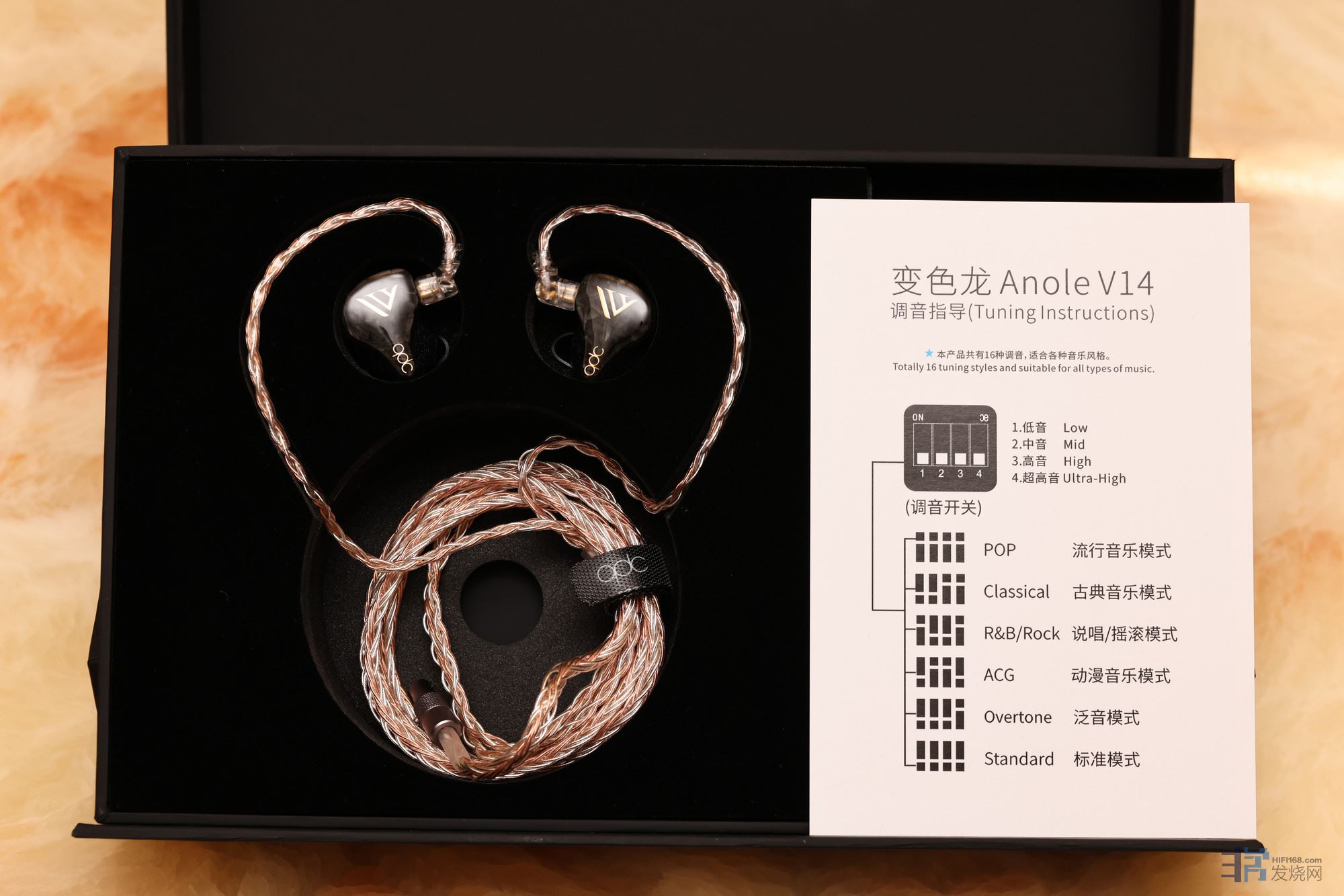 取出便携盒,就见到耳机的全貌了,包装盒内配一张清晰的调音配置图。