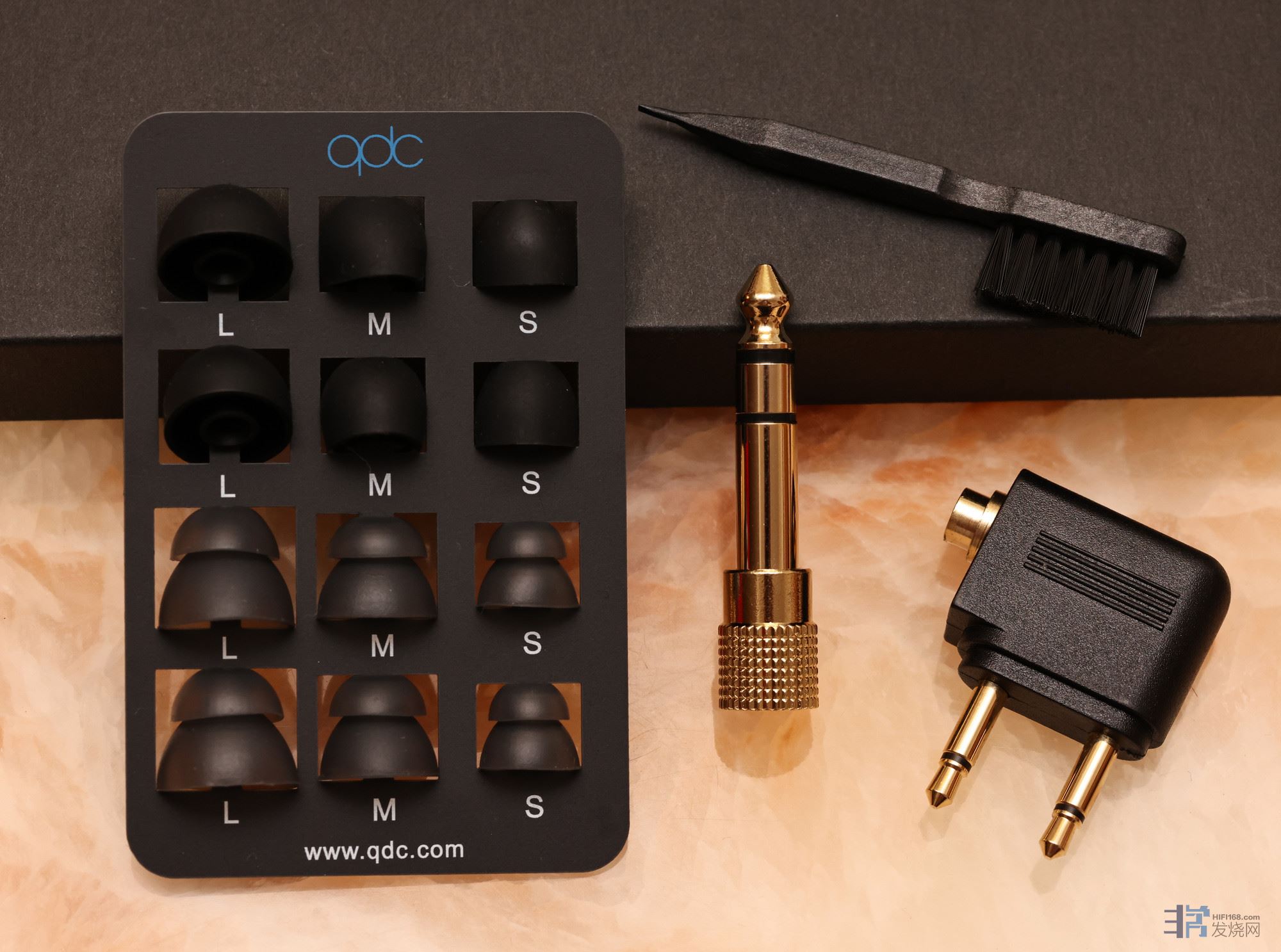 V14丰富的配件:飞机上用的转接插头,3.5mm转6.35mm插头、六对不同尺寸塞套,一个耳机清洁棒,这个清洁棒的另外一端可以拨动耳机的调音开关。