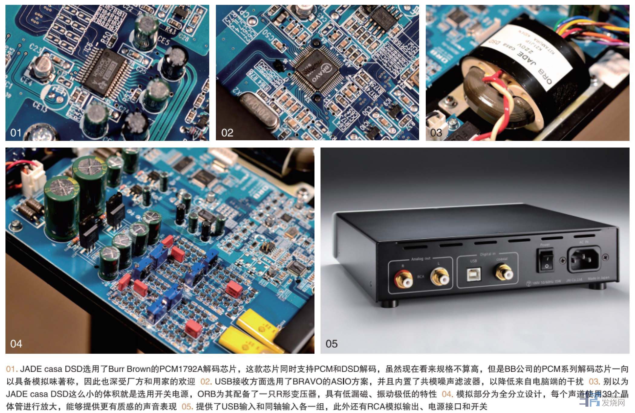再来看看模拟部分,采用无反馈放大设计,只传输无噪声的纯音乐信号,带来更低的失真。此外,线路为全分立设计,每个声道使用39个晶体管进行放大,能够提供更有质感的声音表现。此外,JADE casa DSD更提供了正相和反相切换功能,由于不同年代不同公司的数码录音会有不同的相位设定,通过这个功能便可方便地享受到最原始的声音。