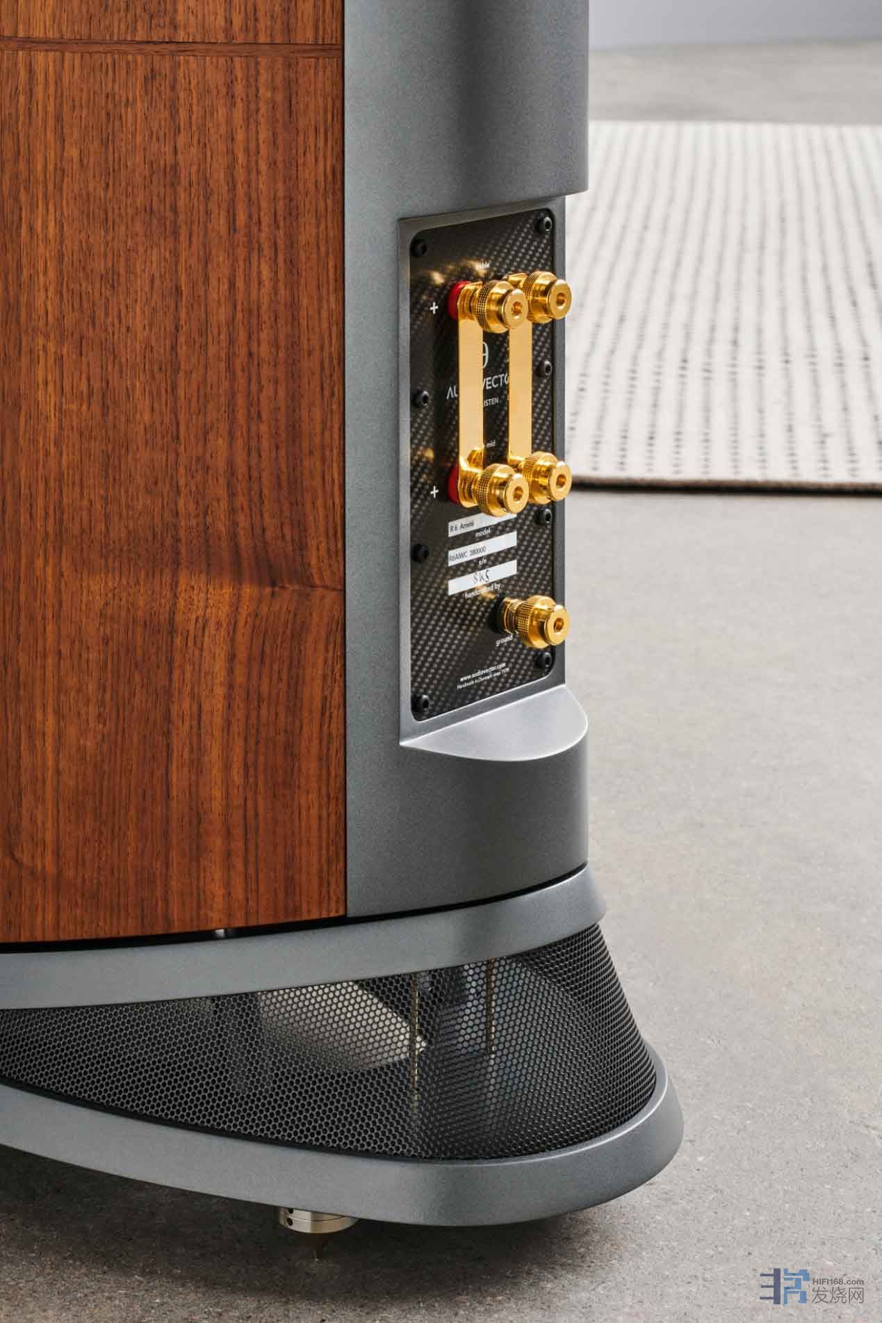 R6 前障板上的中低音驱动单元均为 6.5 英寸碳纤维音盆,采用钛线圈技术,使用三点悬浮式锁固方式,膜片由 “交织芳纶复合纤维”制成,在丹麦手工制造。高音单元采用 R AMT Arrete,与 R3 极点 相同。现在,如果您已经回去再次阅读 R3 的评测,就会发现 R6 除了在外形上比 R3 更大之外,还在前障板增加了几个倒相口,但,这肯定不是唯一的区别! R6箱体内部隐藏着另一个 6.5 英寸内置低音驱动单元,和一个向下发射的 8 英寸低音单元,它们采用等压(相同压力)配置。等压低音并不新鲜,许多人都记得 Linn和  WilsonBenesch都采用了这种系统。等压低音系统(Audiovector 称其为等压复合低音系统)通过箱体中的空气将两个低音驱动单元的质量耦合在一起。