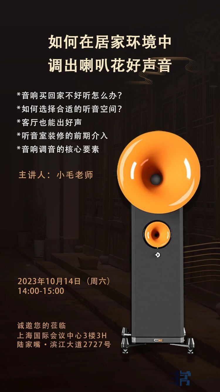 同时,在10月14日下午2点-3点,我们将邀请到小毛老师为广大烧友带来主题讲座——《如何在居家环境中调出喇叭花好声音》。众多独家内容和精彩试听分享将会是知识和声音的双重盛宴。欢迎各位烧友光临。