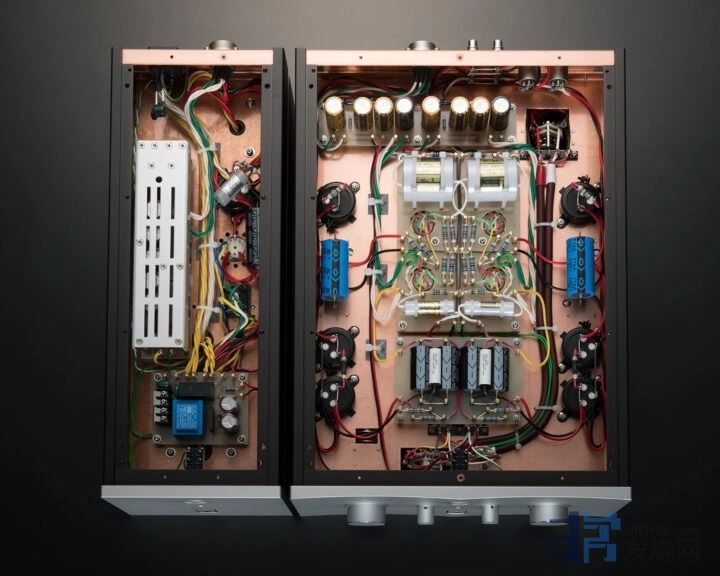 G-700i采用4支6072/12AY7真空管,两侧有一共6枚大电容及两枚金属盒子,跟G-1000i差不多一样,唯一不同是G-1000i那4支6072真空管后方有两个黑色金属盒子,G-700i是没有的。